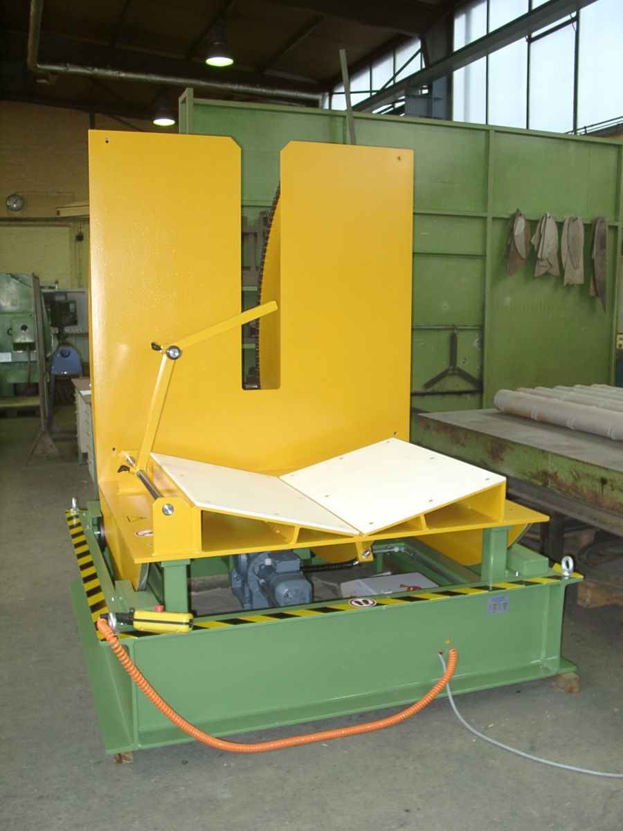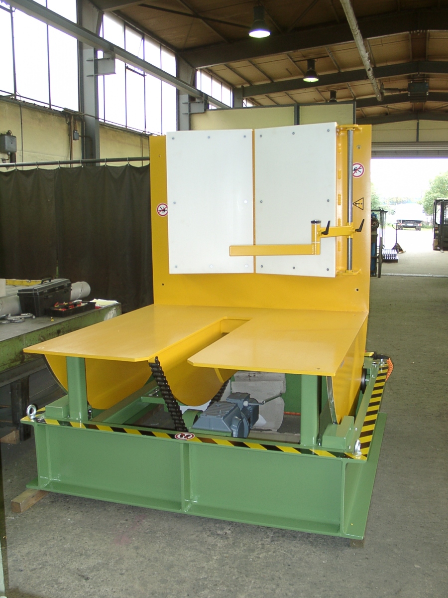 Als eine weitere Ausbaustufe gibt es die zusätzliche Drehvorrichtgung, die es ermöglicht, den Schwenktisch sofort in die Ladeposition zu drehen und der Stapler kann das gewendete Coil sofort wieder abnehmen.