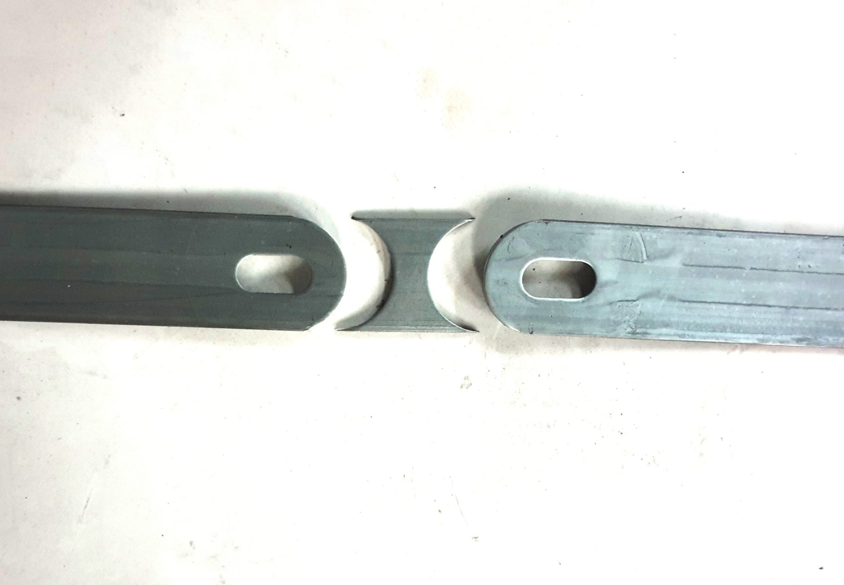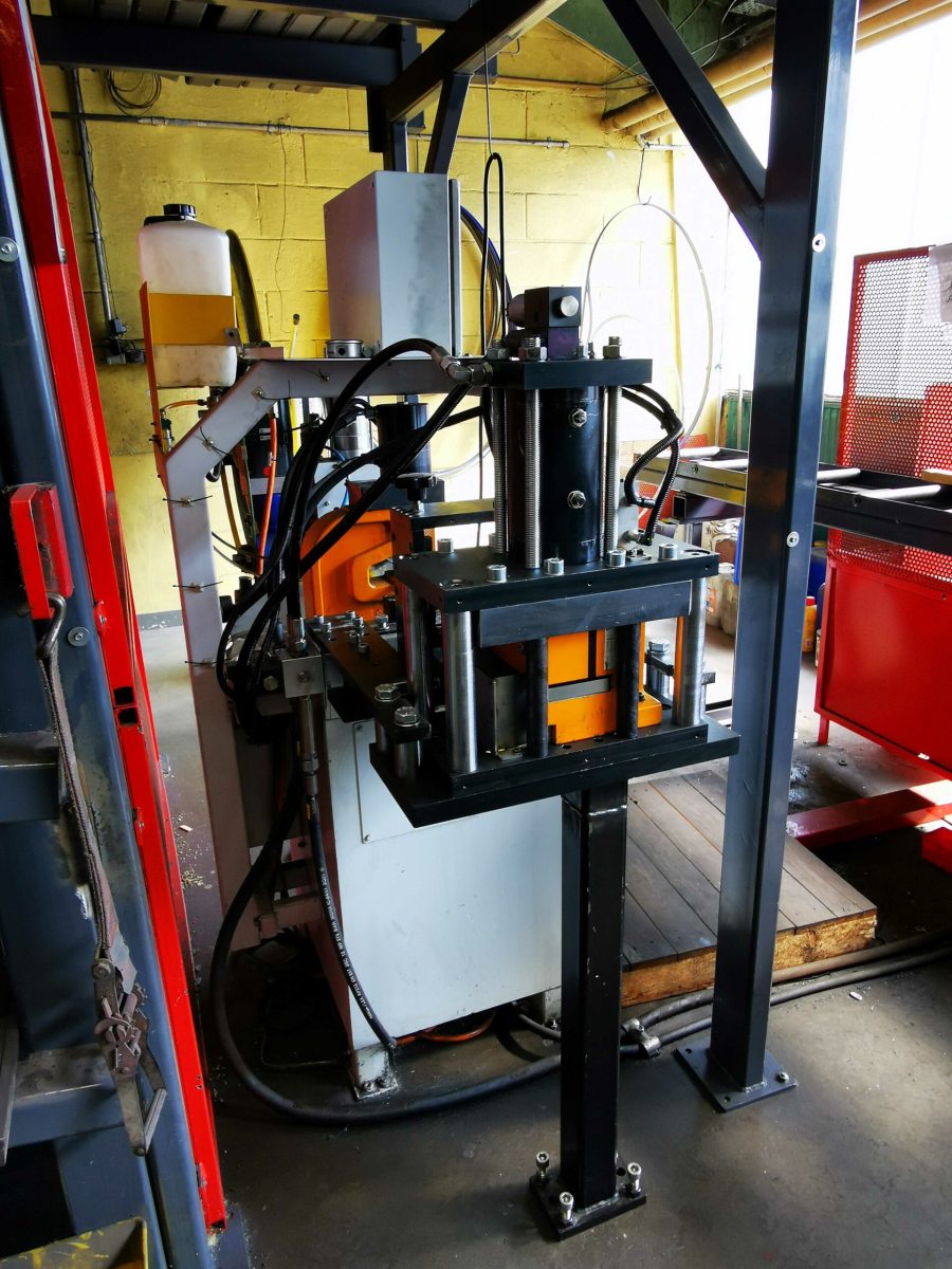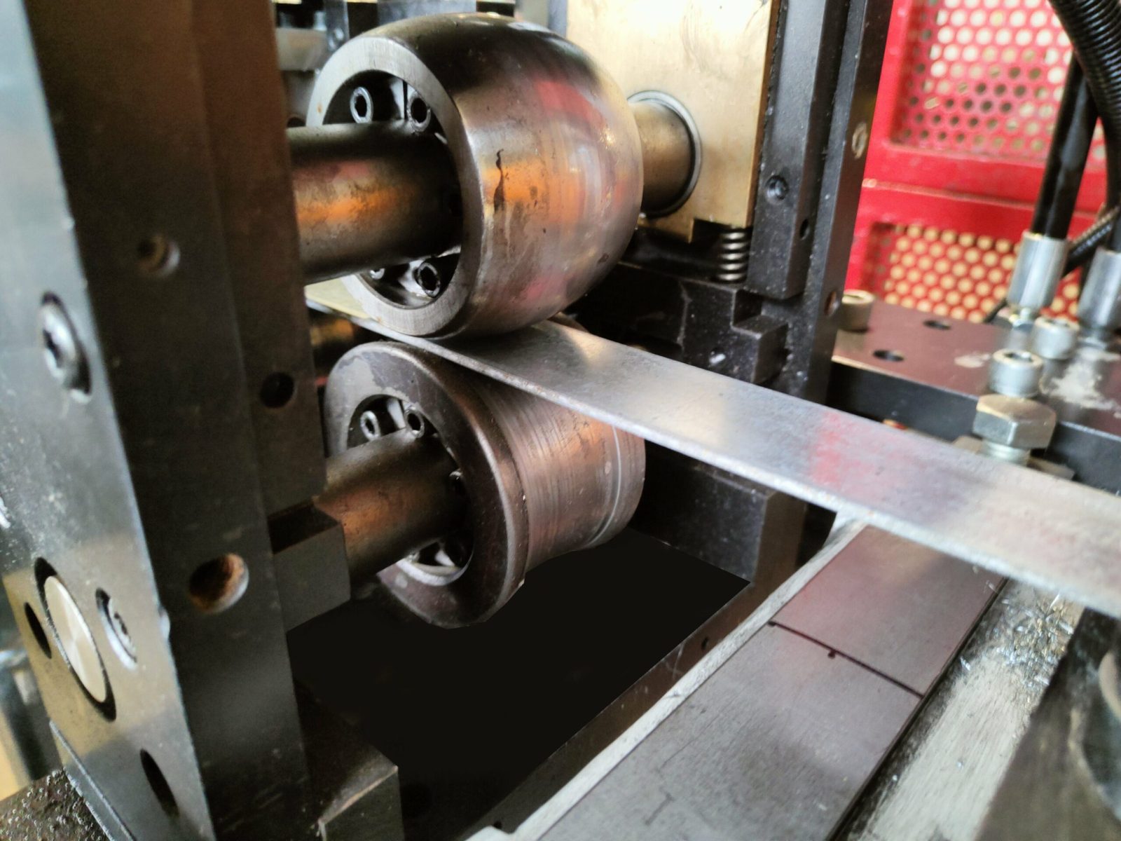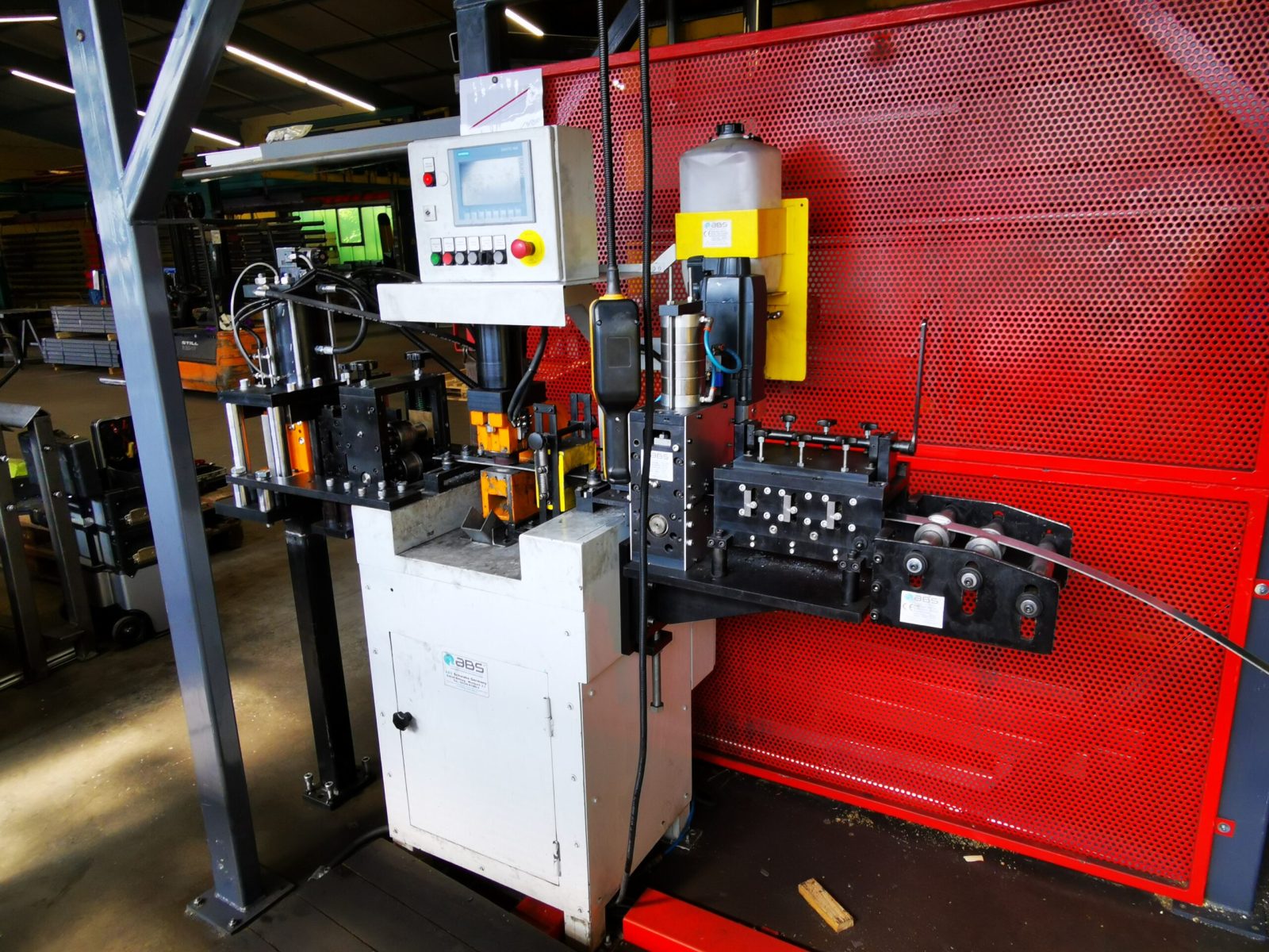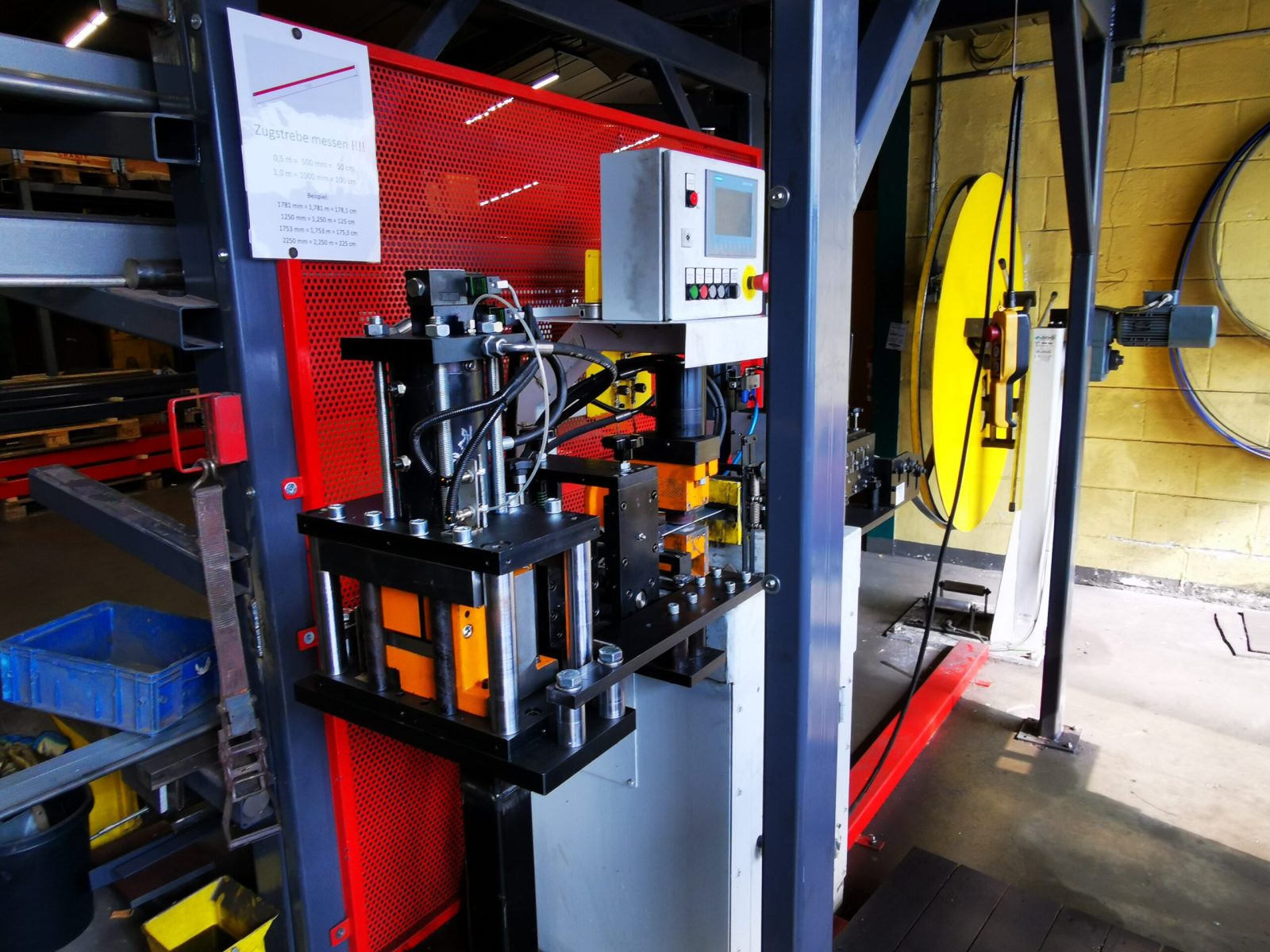 Querteilanlage mit Lochstanze / Profilierwalze für Strebenverstärkung wird für die Herstellung von Streben und Diagonalen für Silos und Regale verwendet. Eine Abhaspel wickelt ein Coilband 40×3 mm in eine Vorschub-Richtanlage, die das Band durch eine Anlage mit Schmierwalze, Lochstanze, Profilierwalze und Nachrichtrollen fördert. Anschließend werden die Stäbe zwischen den Lochungen über ein Rundschnittwerkzeug abgeschnitten. Die Längen der Abstände des Loches an den Enden sowie die Gesamtlängen können über ein Touchpanel eingestellt werden.