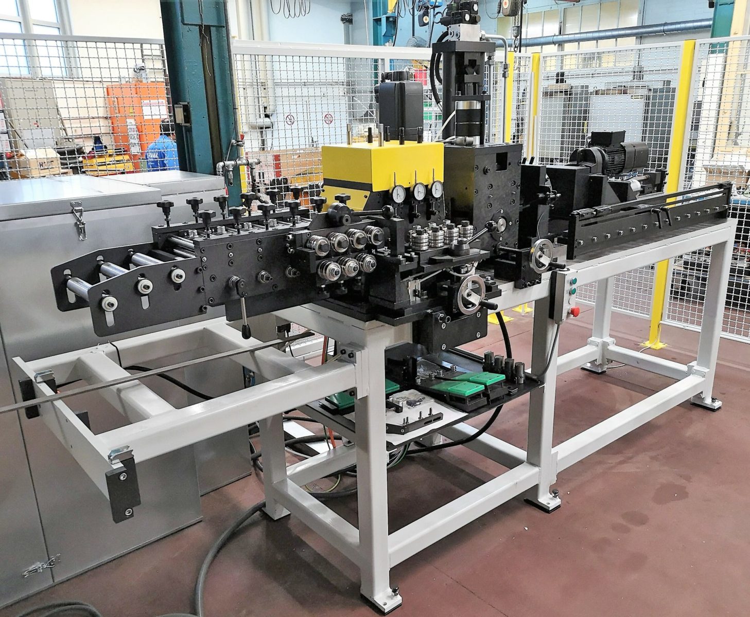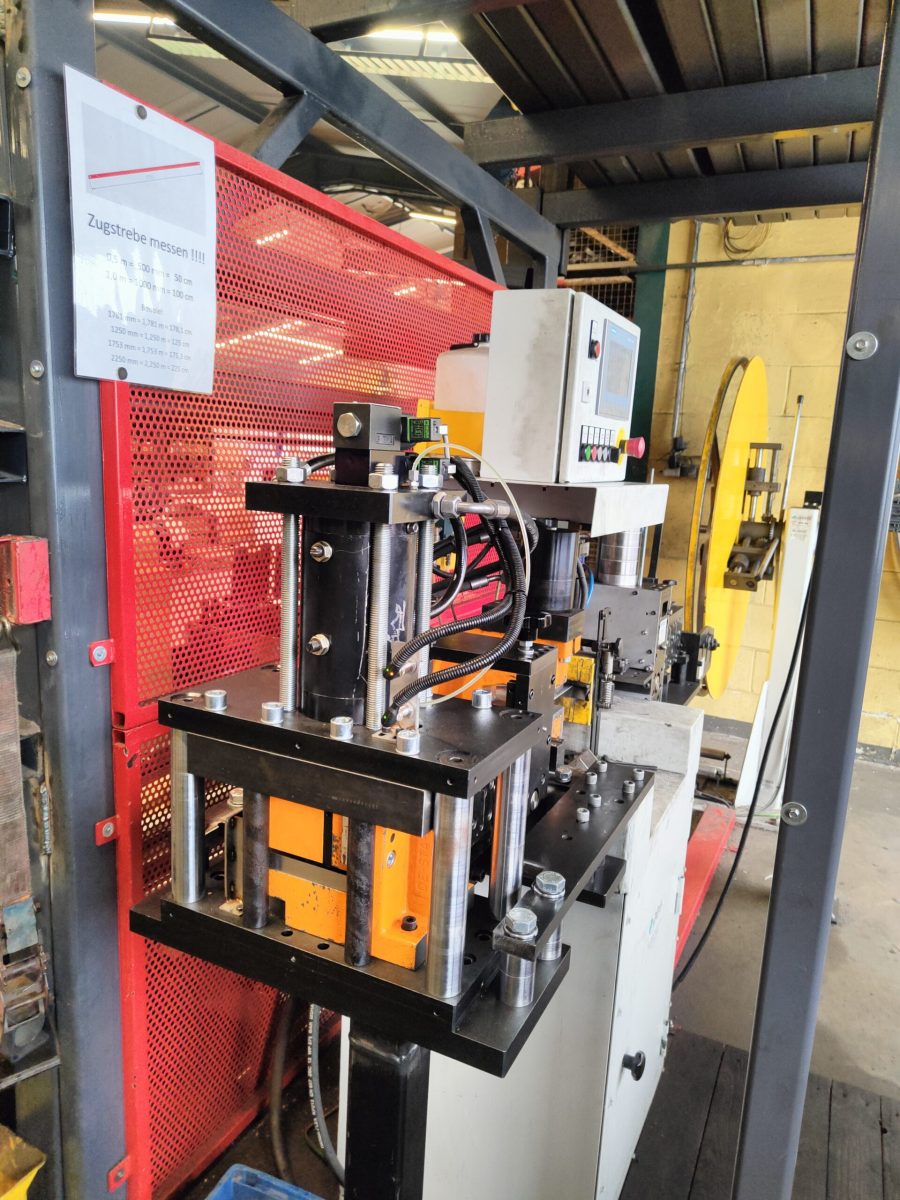 Diese Anlage wickelt Band vom Coil ab, ein Servovorschub zieht es durch eine Hochkantrichtanlage und anschließend durch eine Flachrichtmaschine in eine Drehhebelschere. Vor dem Abschneiden wird das Material verdrallt / verdreht. Diese genaue immer wiederkehrende Verdrehgrad kann über die Steuerung eingestellt werden. Der Verdrehtantrieb ist dazu servogesteuert. Es können Längen von 40 bis 800 mm gefahren werden.