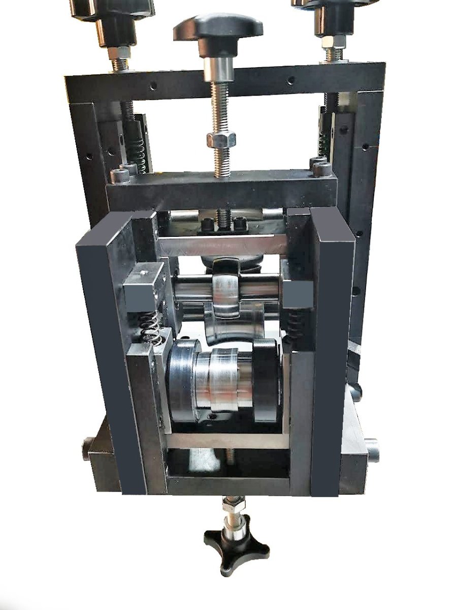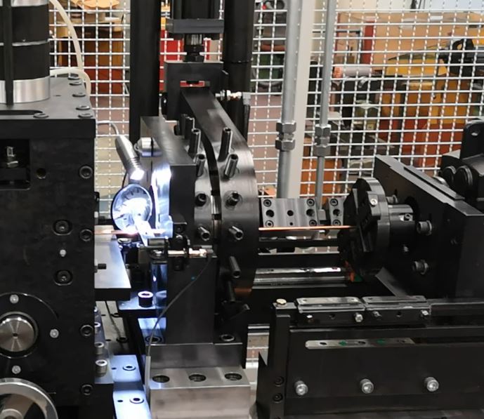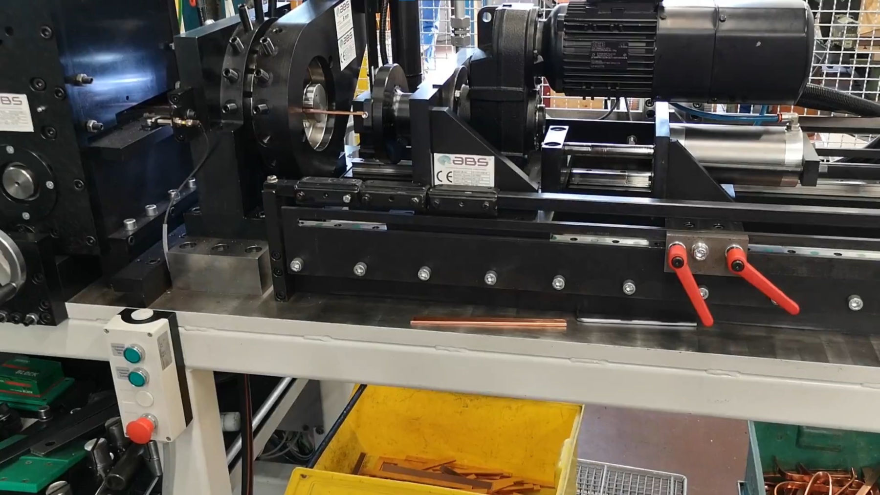 Diese Anlage kann sowohl Runddraht als auch Flachband verarbeiten. Die Schermesser werden für die jeweiligen Abmessungen verdreht, die vielfachen Schnitte sind auf einem Durchmesser der Rundmesser einerrodiert.