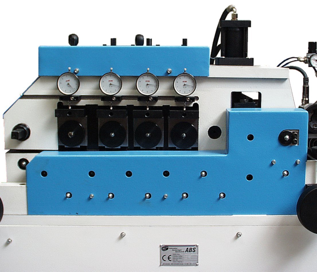 Diese Maschinen sind darauf ausgelegt, den Produktionsprozess zu optimieren. Der Vorschub-Richtkopf hat je nach Ausführung 6, 8 oder 10 Richtwalzen, wobei die letzte Walze immer oben ist, um ein Richten der Coilkrümmung von Anfang bis Ende des Coils zu gewährleisten, ohne groß nachstellen zu müssen. ABS-Schwabe Richttechnik hat unterschiedliche Richtwalzenabstände, der erst Rollensatz hat immer einen großen Abstand, um dickere und hochfeste Materialien leichter richten zu können. Dieser Rollensatz fungiert als sogenannter Totrichter. Mit den anschließenden Richtwalzenpaaren wird feingerichtet und die letzte obere Walze ermöglicht die Geradheit des Materials. Die Zustellung der Richtwalzen erfolgt zentral über Kettenantrieb oder Getriebe, je nach Ausführung. Sie kann auch motorisch über ein Programm erfolgen. Das Servogetriebe wirkt direkt auf die Unterwalze, standardmäßig sind die unteren Richtwalzen und beide Vorschubwalzen am Auslauf über Zahnräder synchron miteinander angetrieben. Die obere Vorschubwalze wird parallel über einen achsial gelagerten Schwinkopf und Zylinder zugestellt, 2 einstellbare Feinspindelschrauben wirken dabei auf die Kulissensteine. Somit ist die Walze spielfrei zustellbar, auch bei außermittigem Bandlauf kann die Walzen nicht wegkippen.