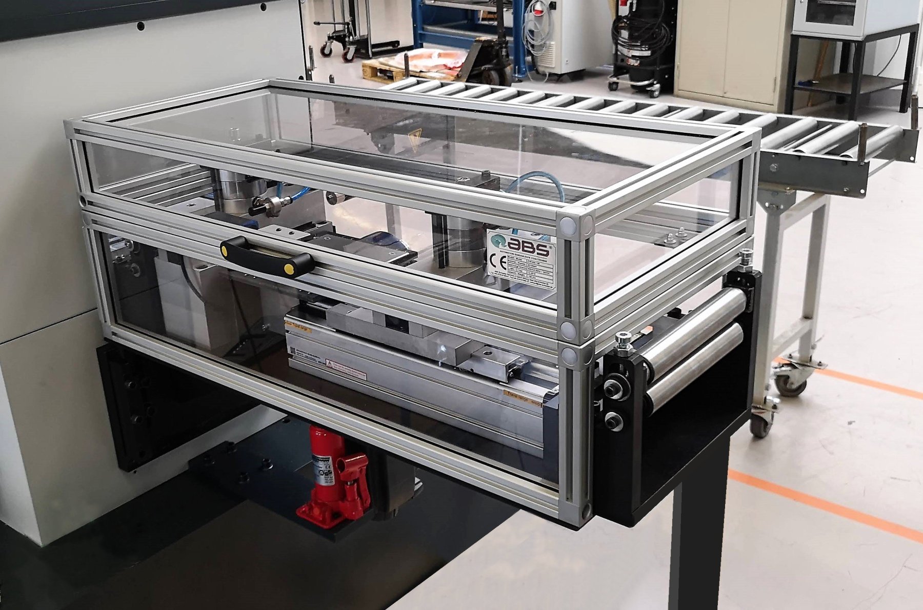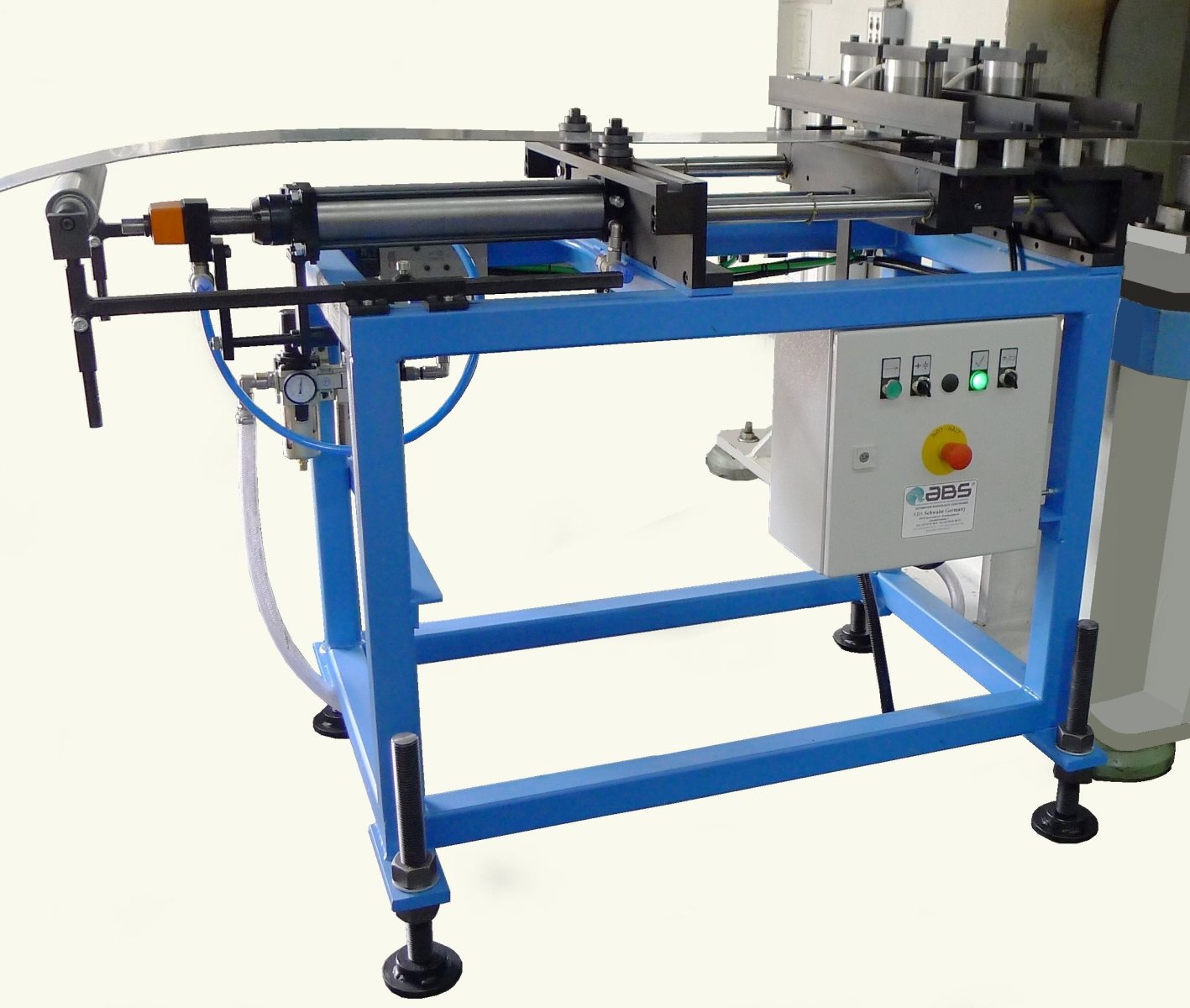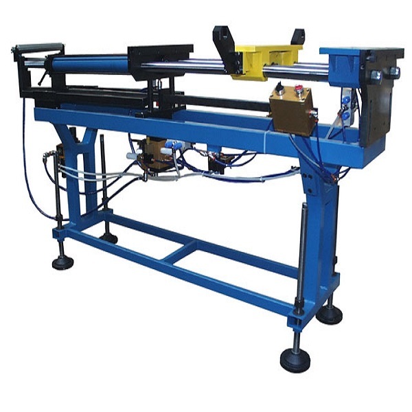Diese Vorschubeinrichtungen sind mit speziellen Zangen ausgestattet, die das Material sicher greifen und kontinuierlich in die Maschine führen, wo es weiterverarbeitet wird. Der Antrieb ist vorrangig pneumatisch. Diese Konstruktionsart ist im Baukasten konstruiert, die ABS-Pneumatikzylinder sind aufstockbar für die Erhöhung der Klemmkräfte, die Zylinderbrücke kann einfqach erhöht werden für Profile mit Sonderzangen, der Vorschubzylinder ist ein Luftsparzylinder, wobei die Vorschublänge den Zylinderhub begrenzt über eine Stellspindel, die Einstelllänge wird über eine Meßuhr abgelesen.