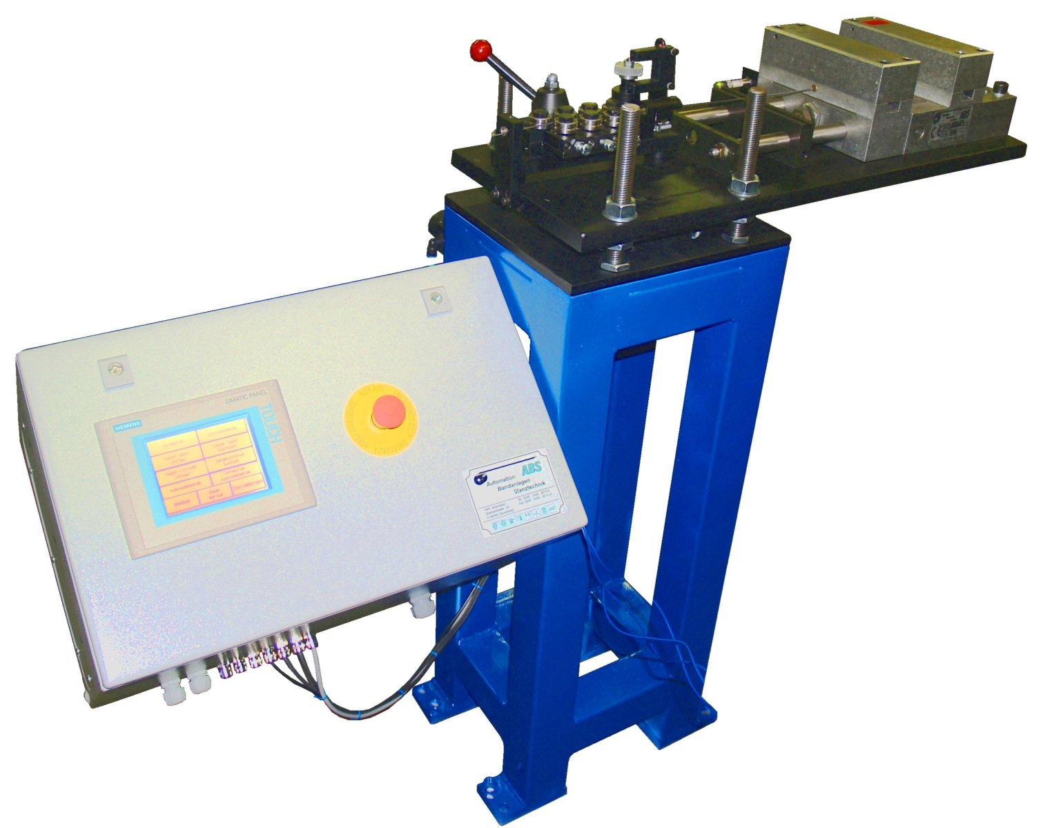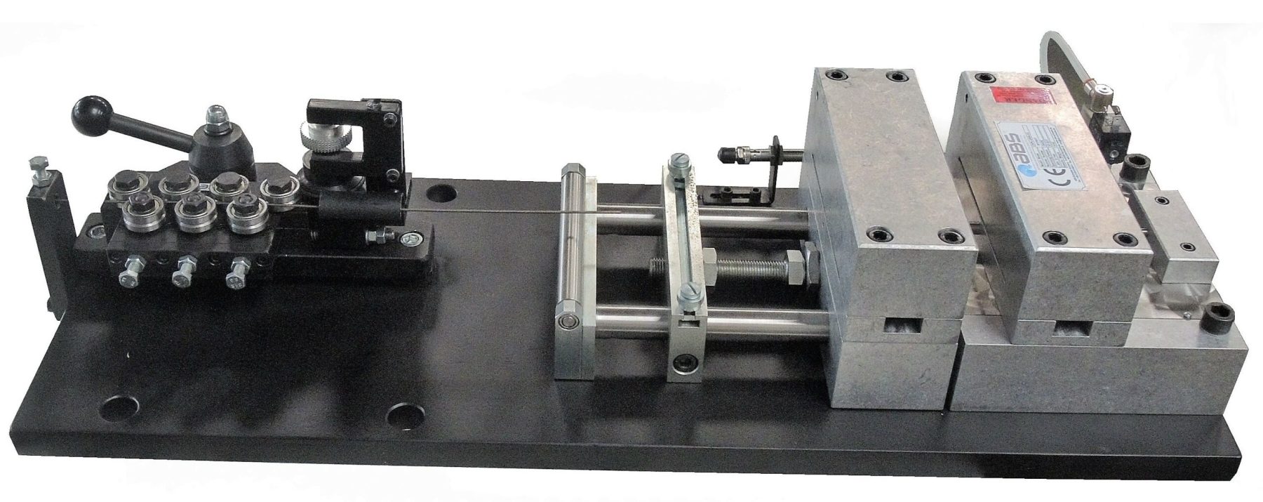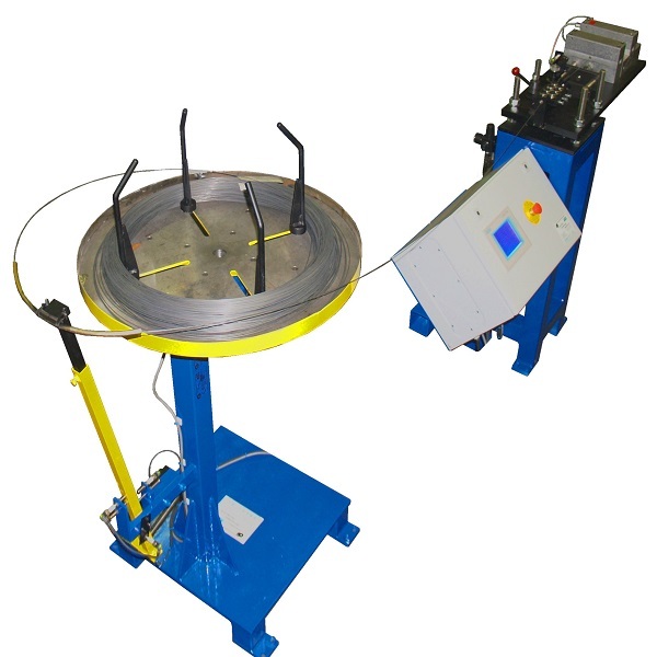 “Drahtabwickler mit Richtgerät + Zangenvorschub” ist eine Anlage zum Zuführen von Drahtabschnitten. Dabei wird ein hochfester Klavierdraht von einer liegenden Haspel abgewickelt und von einem Zangenvorschub mit Drahtrohrführung durch eine Richteinheit gezogen. Schließlich erfolgt das Schneiden des Drahts auf die gewünschte Länge in einer kundenseitigen Vorrichtung, hier für das Testen von Seitenschneidern.