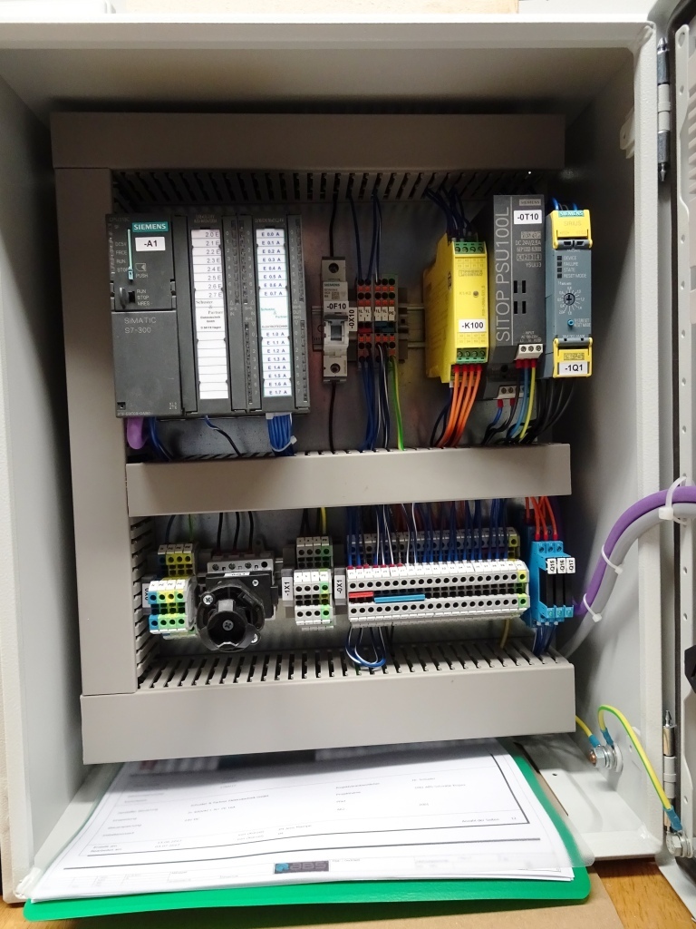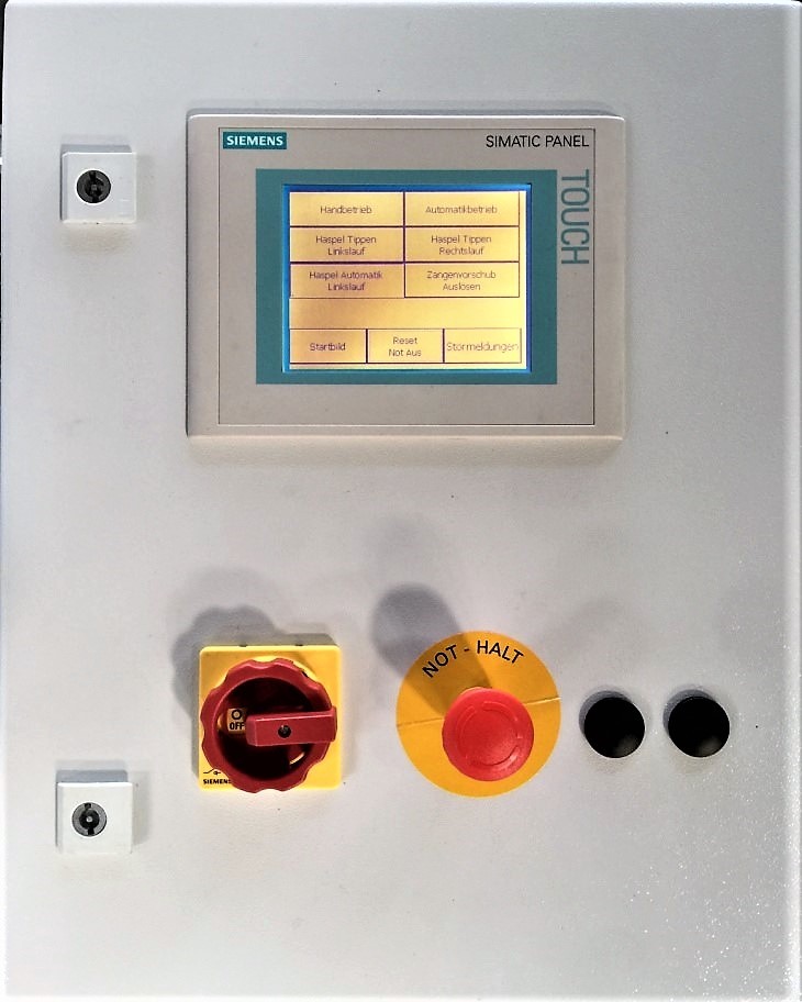 Besonderheit bei dieser Anlage : SPS-gesteuert mit Längenmesssystem über Lichtschrankenindikator. Hier wird bei nicht erreichen der Vorschublänge die Anlage gestoppt.