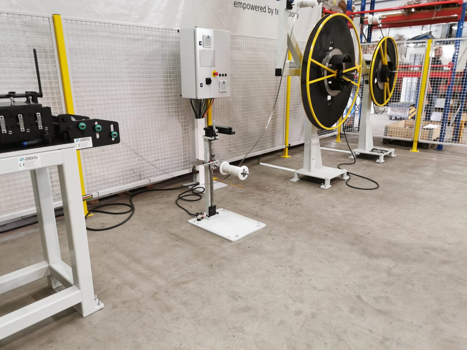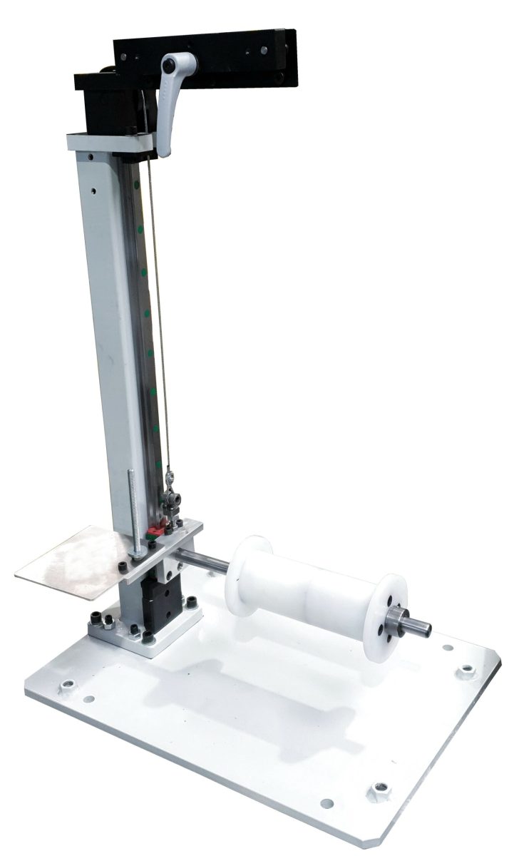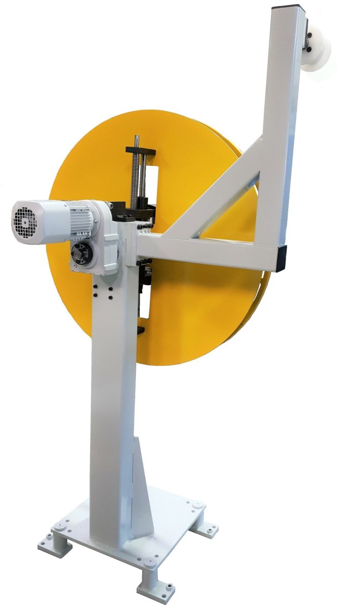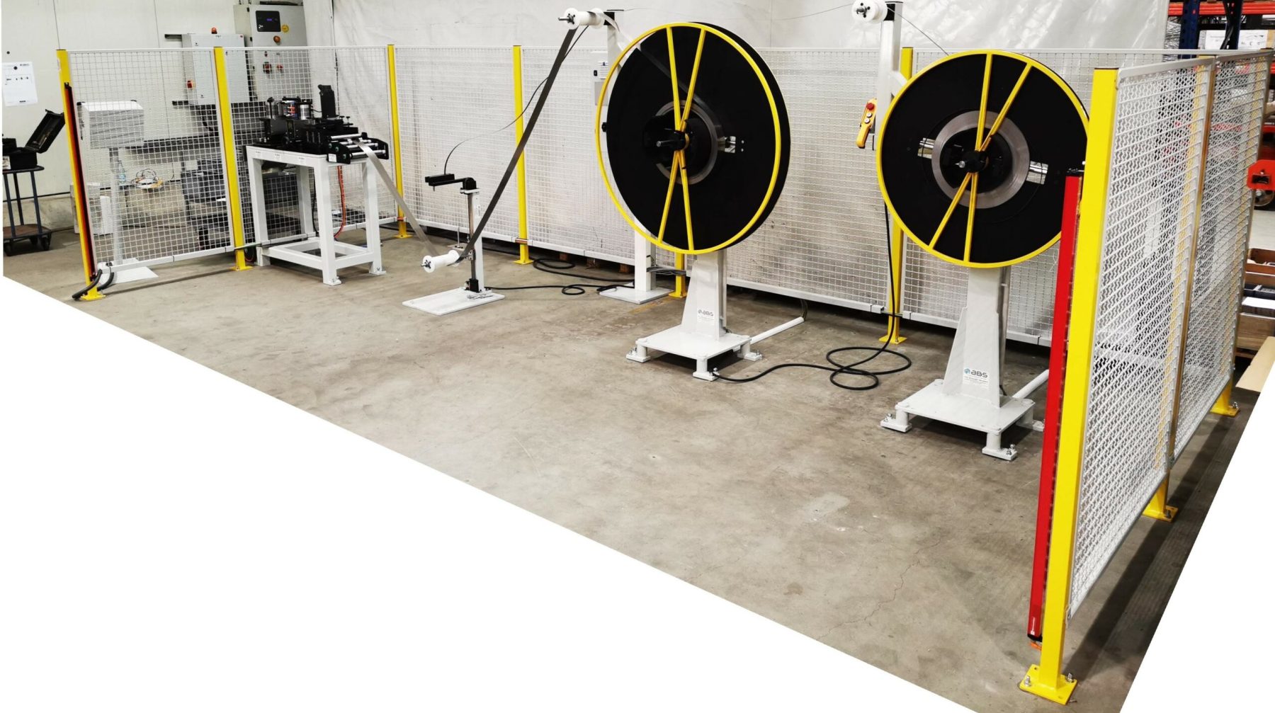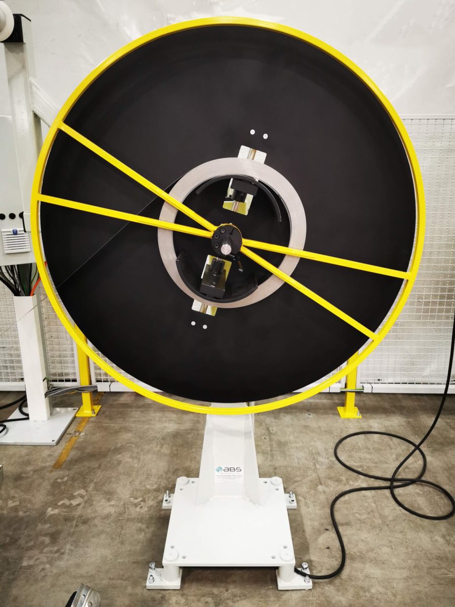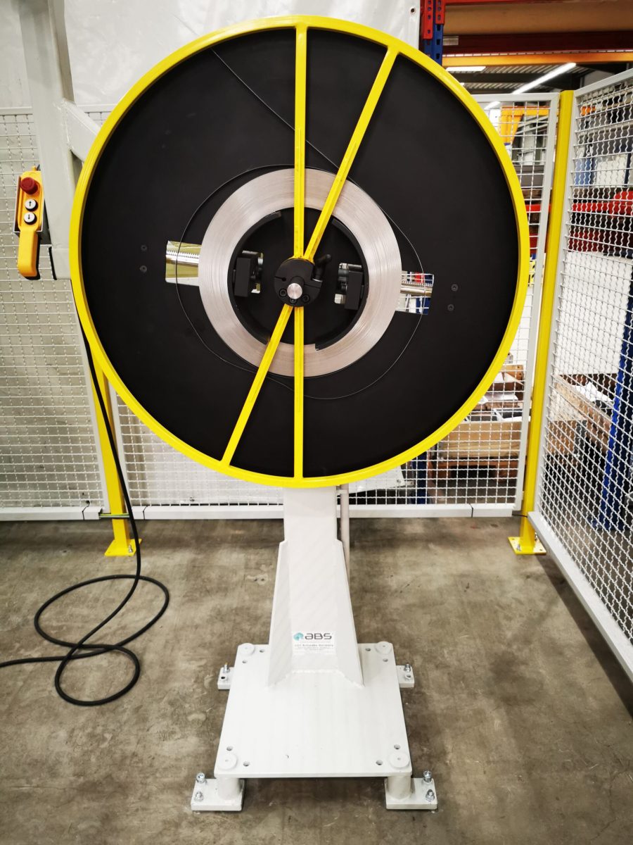 – 2 Haspeln sind hintereinander geschaltet, um schnell das Band umzurüsten. Dabei kann der Bandstreifen, wenn das Coil noch nicht zu Ende verarbeitet wurde,  oberhalb des Tänzer in einer Klemmhalterung festgehalten werden. Durch die Umlenkrollen oberhalb der Haspeln wird das Band geführt. Alle Haspeln sind mit einem stufenlosen Regelantrieb ausgestattet, die Geschwindigkeit wird stufenlos über den Tänzer mit Ausgleichgewicht geregelt.