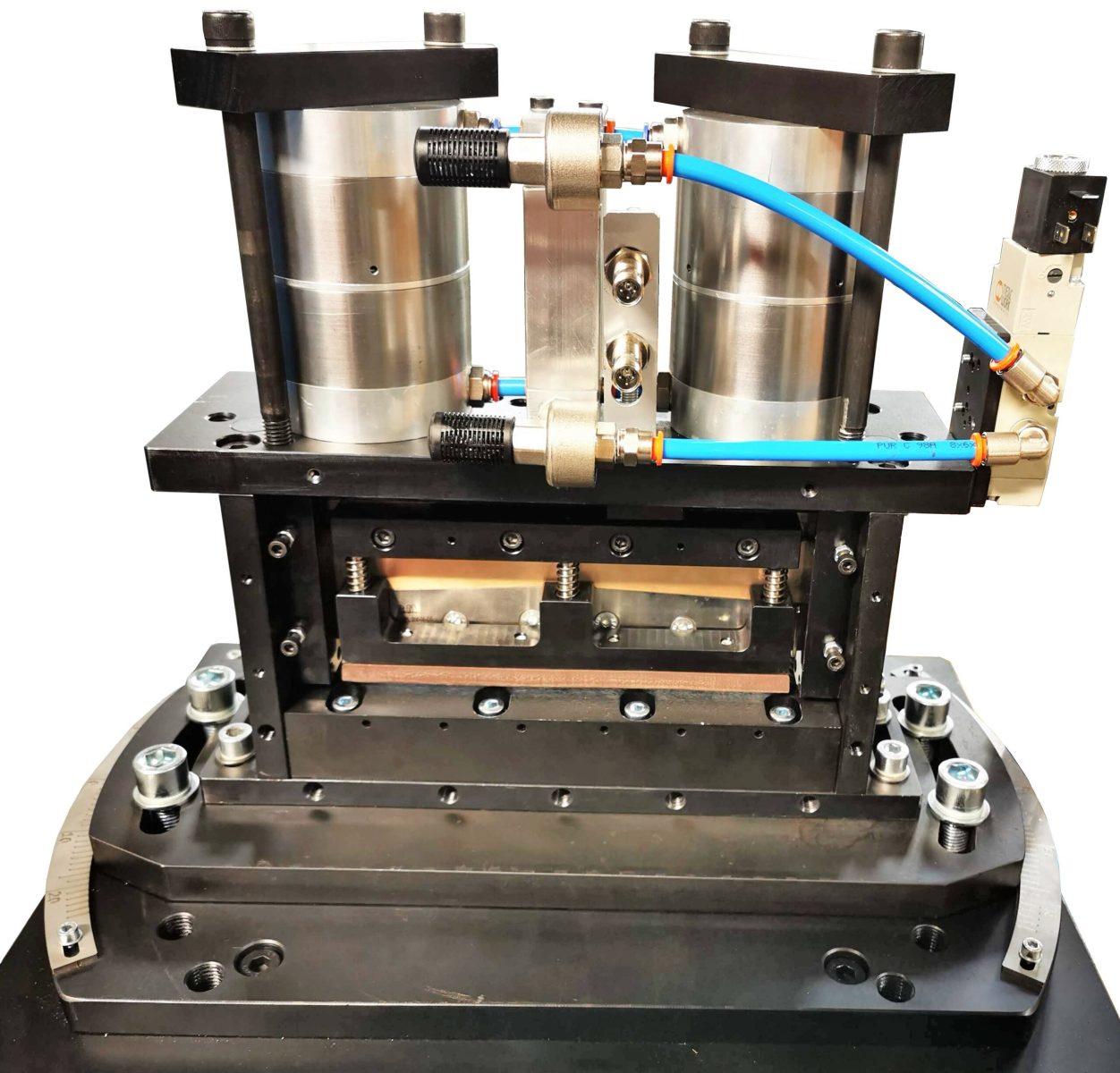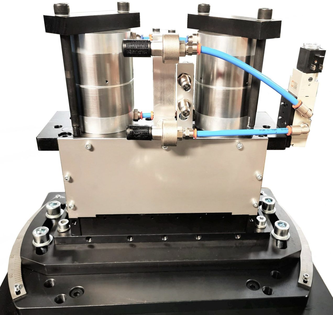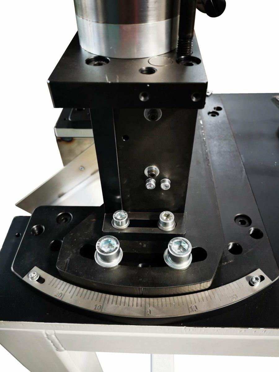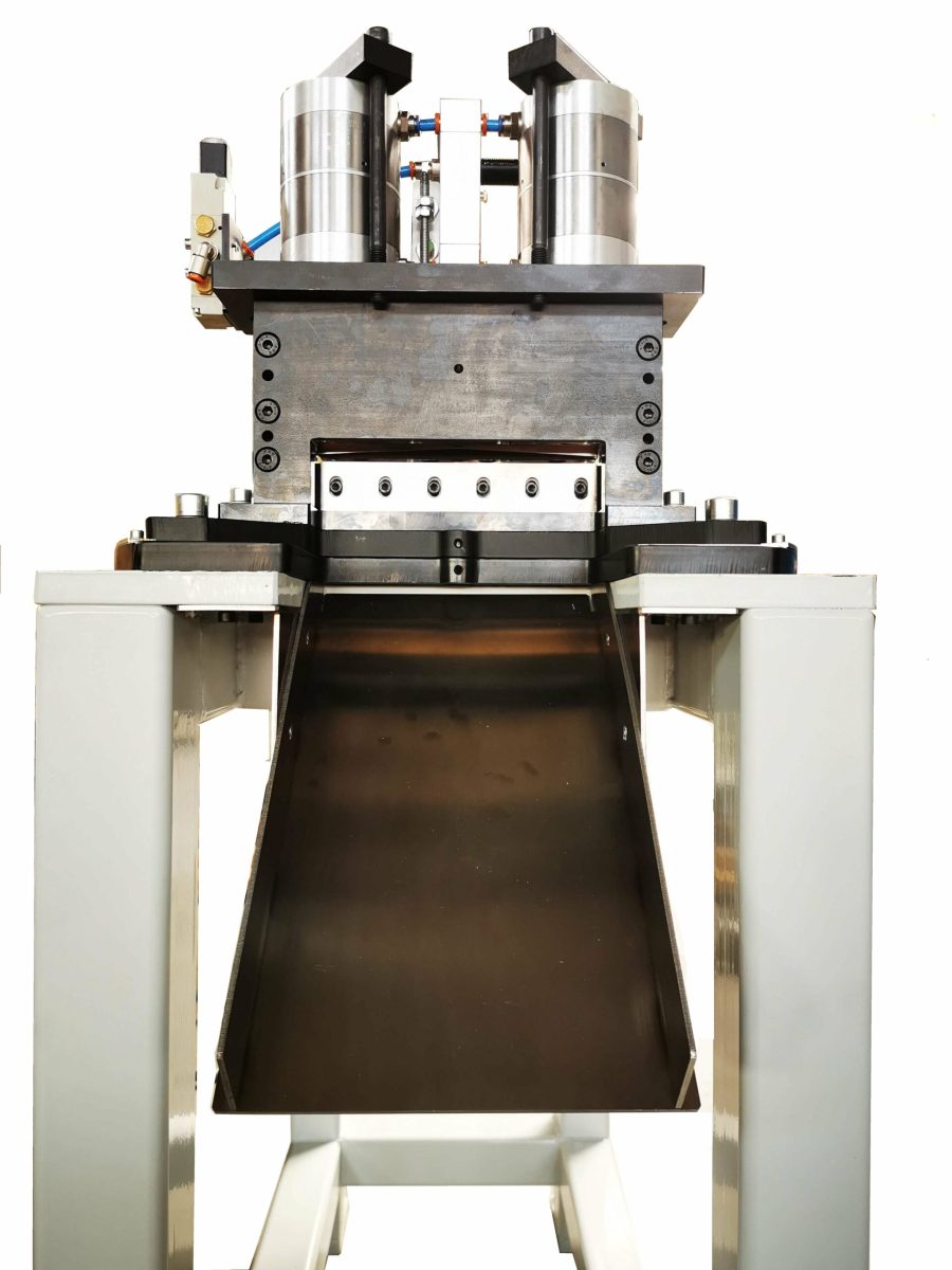 – Die Trennschere hat eine Dachschnitttechnik mit großem Messerbalken und zustellbaren Führungsleisten, das Untermesser ist zustellbar und fein justierbar. Dazu kann man die Schere bis 72 Grad verdrehen, um einen Schrägschnitt auszuführen. Die Messer sind für Materialien S235 und C75 ausgelegt.