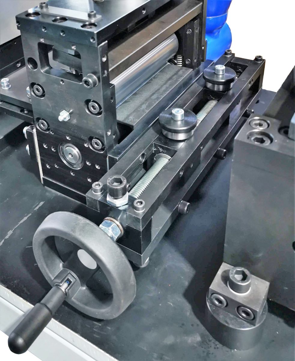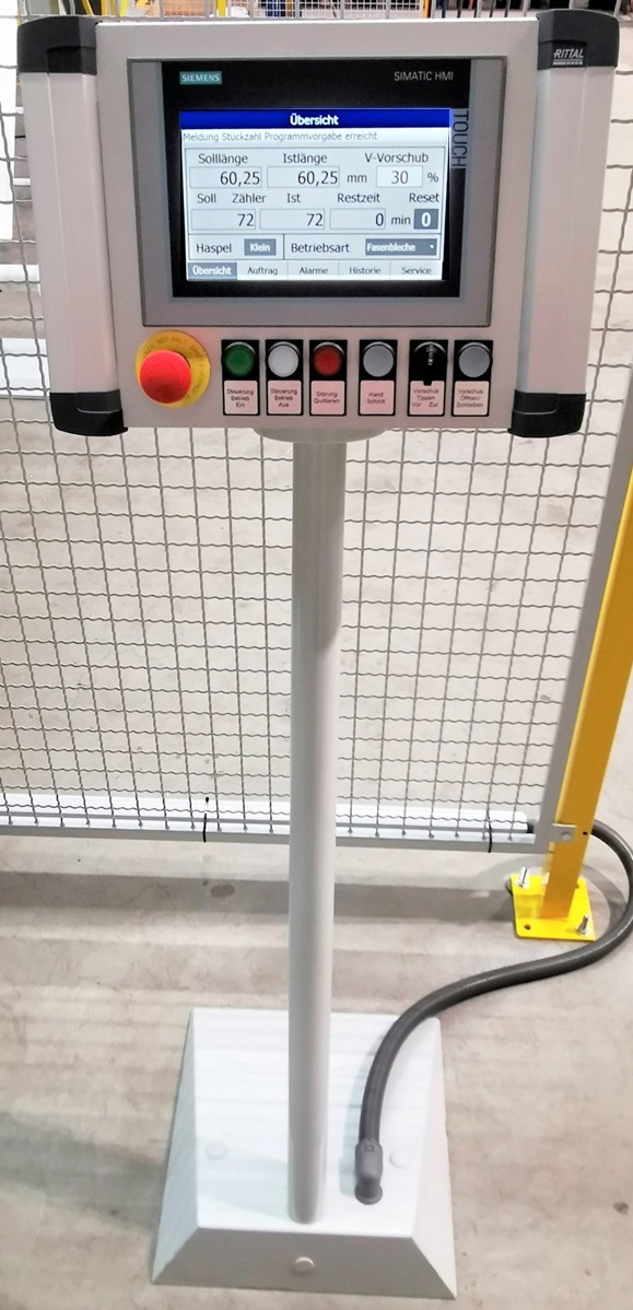 – Die spezielle Software ermöglich eine kundenspezifische Schnittlängentechnik für die untrschiedlichsten Materialien, abspeicherbar. Hier kann es z.B. so programmiert werden, dass jeder Hub 0,5 mm länger ist, um einen Kamm herzustellen. Die Haspelsteuerung hat eine Tänzerlageregelung und passt sich automatisch an die Coilgröße an.
