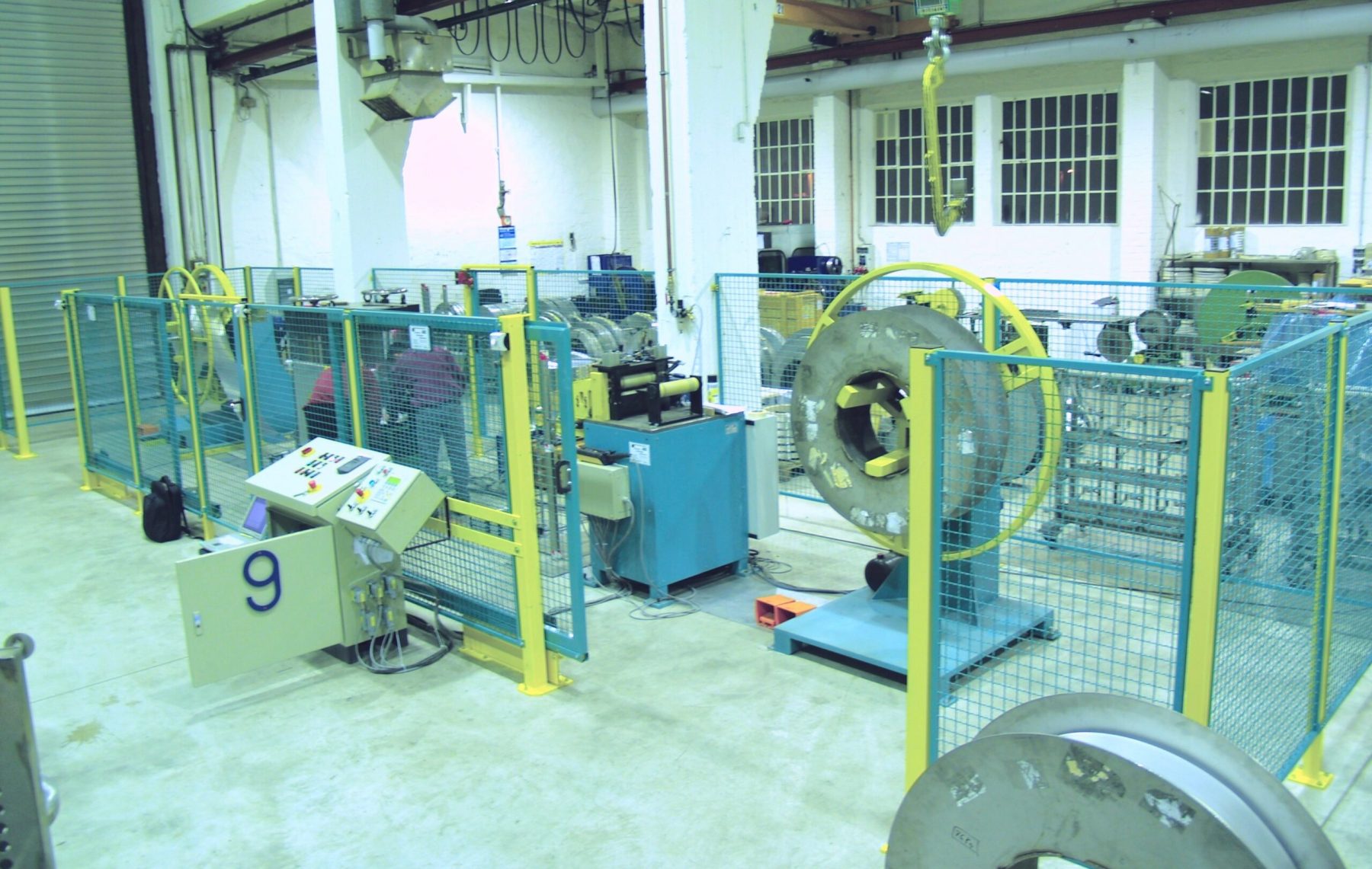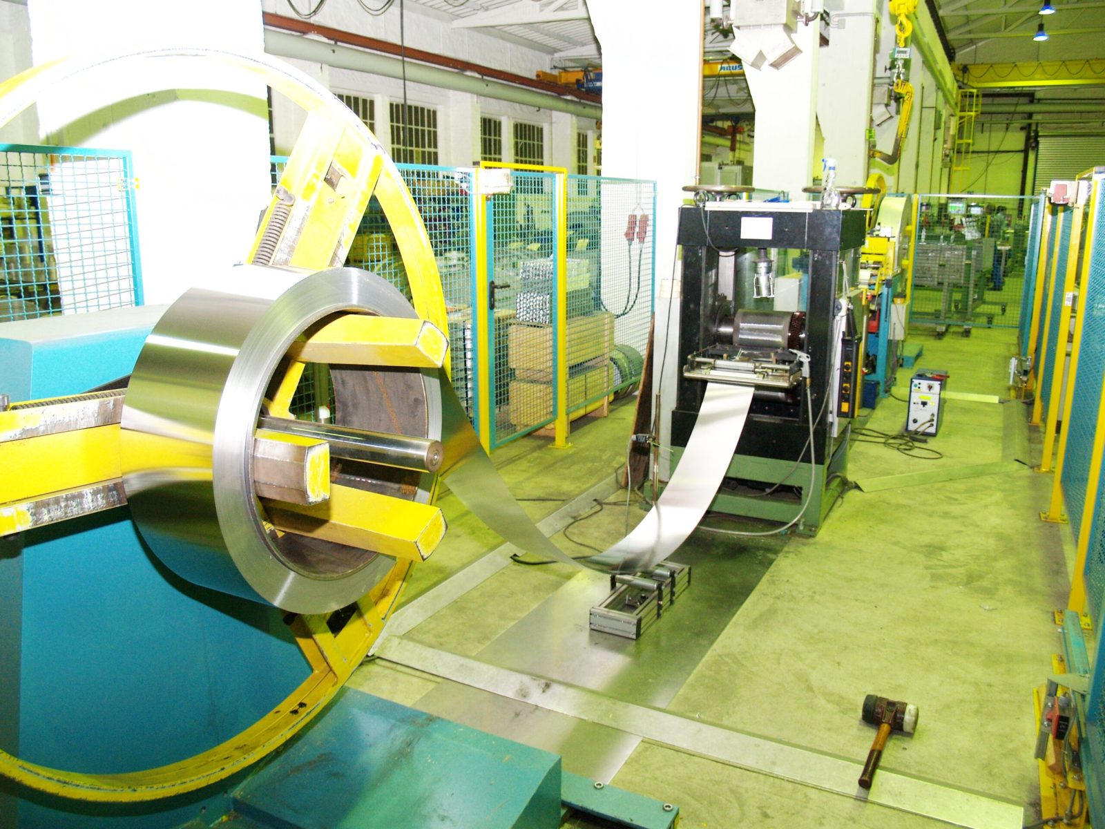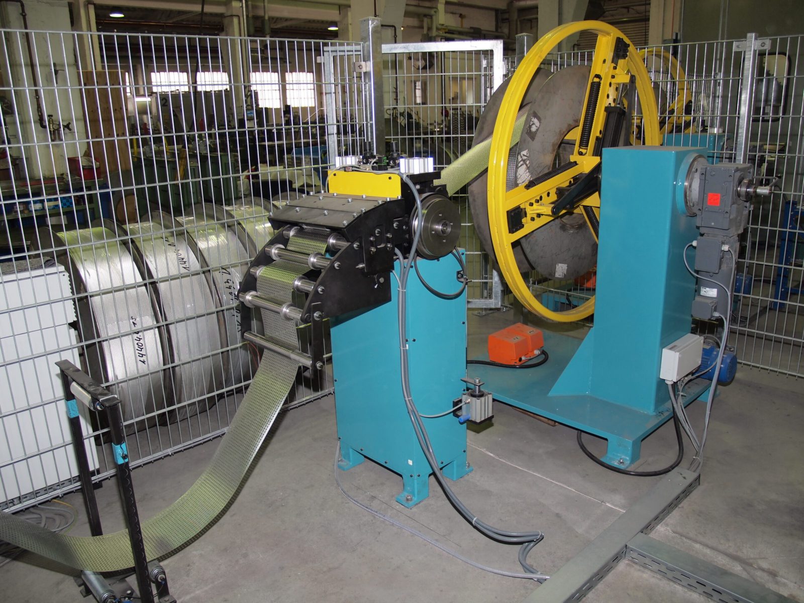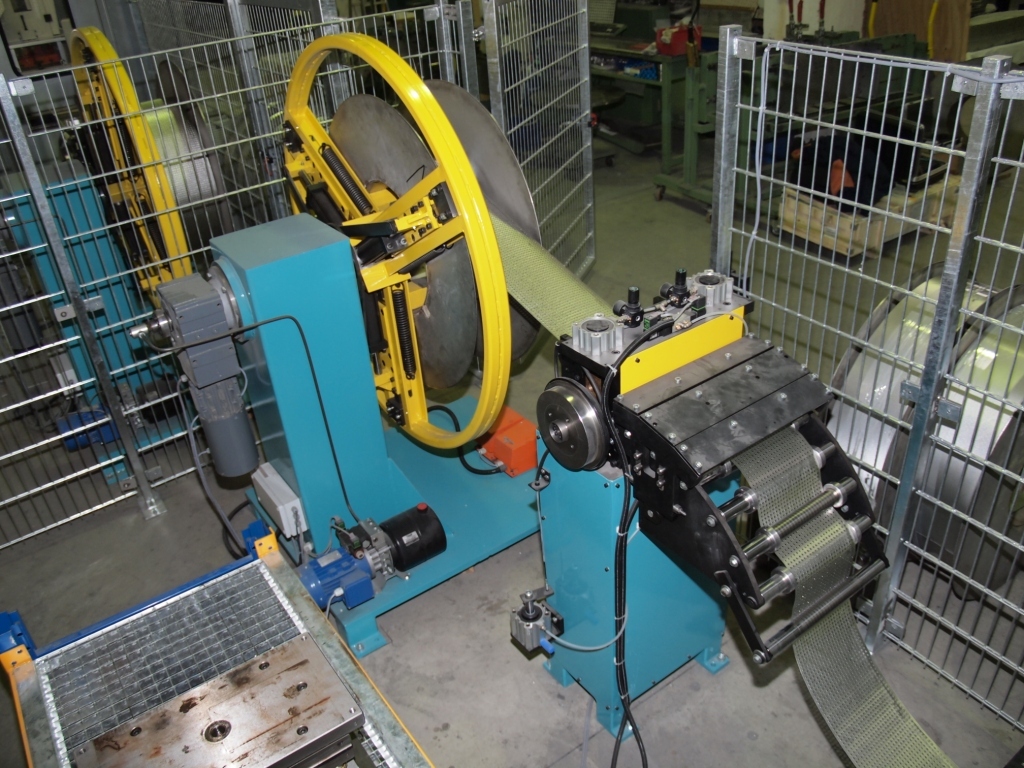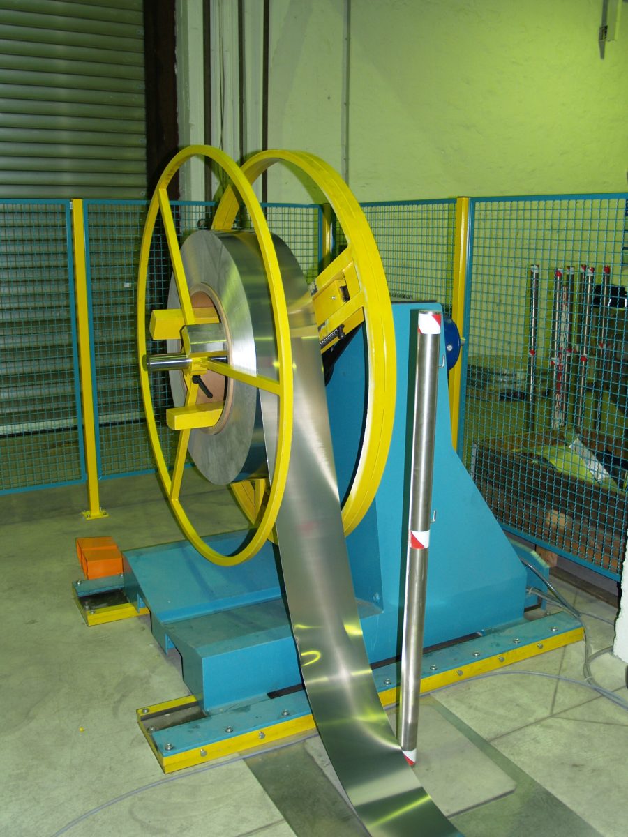 Eine “Umspulanlage mit Strukturwalzen” versieht die Oberfläche des Bandmaterials mit Kleinstwaben. Das Material wird für unterschiedliche Industriezwecke verarbeitet, die genaue Verwendung können wir aus vertraglichen Geheimhaltungsgründen hier nicht erklären. Hier haben wir eine preiswerte Lösung gefunden, die das Aufwickeln ohne Verfahreinrichtung des Aufwicklers mit Bandkantensteuerung relativ genau Lage/Lage auf eine VA-Trommel für die Weiterverarbeitung ermöglicht -über einen großen Rollenkorb mit Vielfach-Bandführungsringen sowie Niederhalterollen, die über eine Exzentereinrichtung diese zwischen die Tragrollen drückt sowie über ein Bremsgerüst und Umlenkrolle.
